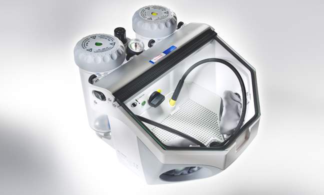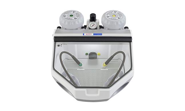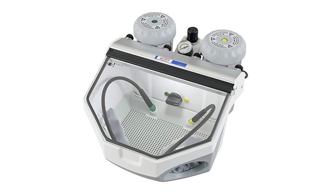 La ventaja de Renfert: La cámara de chorreado completamente iluminada (4.800 lux) garantiza una mejor detección de los contornos y detalles de su objeto.