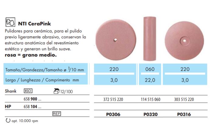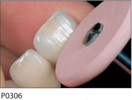 Pulidores para cerámica, para el pulido previo ligeramente abrasivo, conservan la estructura anatómica del revestimiento estético y generan un brillo suave. Color rosa = grano medio