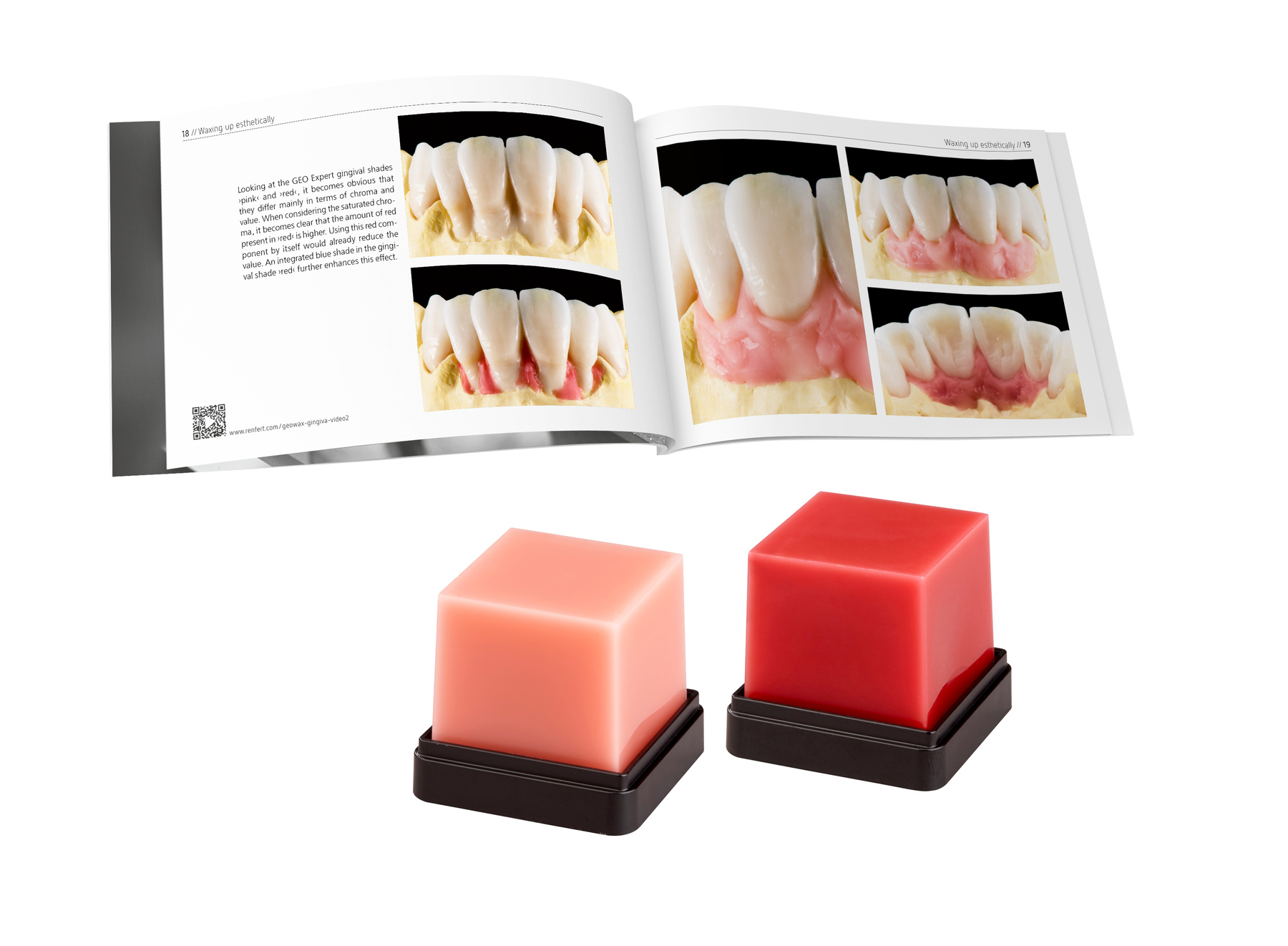 Las ceras GEO Expert Gingiva pink y red son ideales para el encerado de encía artificial en las zonas anterior y posterior, en especial para las supraestructuras de implantes. Con ayuda de un manual, fiel a la filosofía de August Bruguera, se reproducen de forma sencilla y realista diferentes encerados monolíticos y estéticos en el color de la encía.