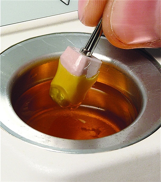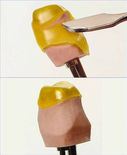 Los colores claros como el amarillo y naranja son excelentemente apropiados para el control del espesor de las cofias. No afectan ópticamente al empleo de ceras de modelado. Gracias al color verde oscuro puede controlarse permanentemente el espesor de la modelación al utilizar ceras claras.
