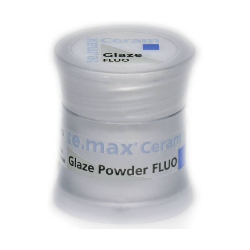 IPS e.max Ceram Glaze FLUO está disponible en pasta y en forma de polvo. Los materiales de acristalamiento fluorescentes se utilizan en las zonas de la restauración que no han sido estratificadas con IPS e.max Ceram. Además, se aplican a materiales de estructuras que muestran ninguna o muy baja fluorescencia y total o parcialmente la reducción anatómica ha sido llevado a cabo para los que.