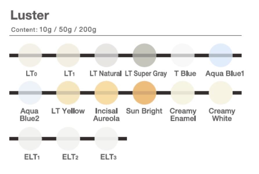 Debido al fino tamaño de las partículas que la componen, la porcelana Luster puede lograr un reflejo selectivo, lo cual asegura una Opalescencia que luzca como el diente natural.