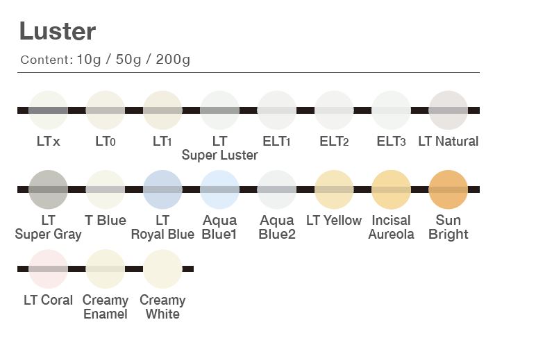 Debido al fino tamaño de las partículas que la componen, la porcelana Luster puede lograr un reflejo selectivo, lo cual asegura una Opalescencia que luzca como el diente natural.