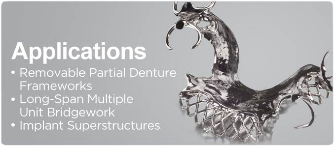 Estructuras de prótesis parcial removible, superestructuras de implantes, sub estructuras para resinas poliméricas (acrílico y composites).