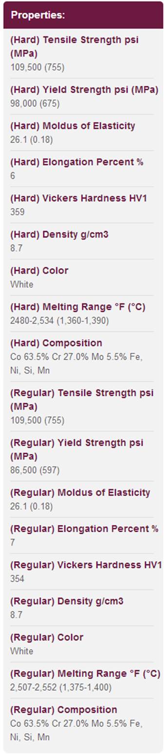 Vera PDN ofrece dureza, elasticidad resistencia a la fractura y un lustre brillante. Vera PDN tiene una formulación equilibrada de cobalto, cromo y molibdeno que produce una capa de óxido protectora pasiva y tenaz. Esto hace que Vera PDN altamente resistente a la corrosión.